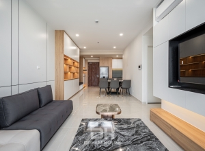 Phòng khách được thiết kế hiện đại sang trọng và ấm cúng với gam màu trắng chủ đạo. Thiết kế ốp vách tường bằng gỗ MDF sáng bóng, và lam sóng được làm bằng gỗ MDF giúp tăng tính thẩm mỹ cho căn phòng. Bố trí ghế sofa đệm màu xám đậm êm ái kết hợp với mặt trà bằng đá thiết kế vuông bo góc ấn tượng. Lót sàn tinh tế tạo sự liên kết cho không gian tiếp khách, mọi thứ hài hòa giúp gia chủ thư giãn.
