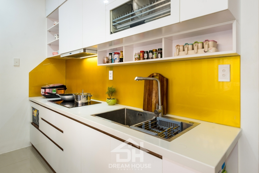 Với không gian căn hộ studio nhỏ sự bố trí kết hợp khu vực bếp và bàn ăn tinh tế tạo nên sự thống thoáng tiện nghi cho khu bếp.